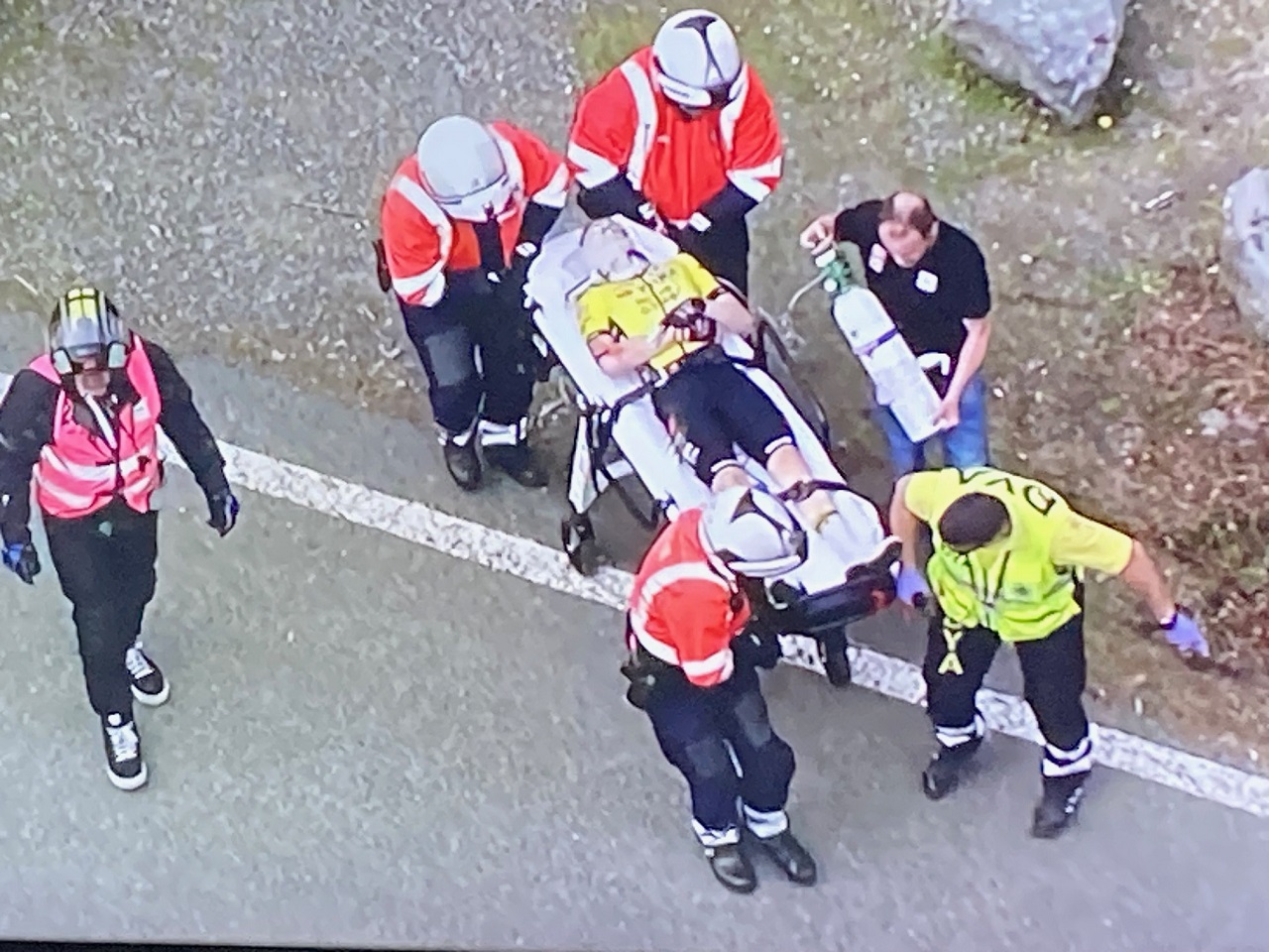Roglič a Vingegaard dopadli tvrdo na zem v betónovej stoke, Evenepoel skončil v lese a spomedzi stromov vyšiel krvavý s podozrením na zlomeninu kľúčnej kosti. Roglič sa pozviechal, no Vingegaard zostával dlho nehybne ležať na zemi. Hoci bol dvojnásobný víťaz Tour de France pri vedomí, museli ho naložiť na nosidlá s kyslíkovou maskou a previezť do nemocnice rovnako ako Evenepoela. Preteky pre vyťaženosť všetkých lekárov neutralizovali. Napokon padlo rozhodnutie, že vedúca skupinka bude bojovať o etapové víťazstvo a pelotón pôjde voľným tempom do cieľa.