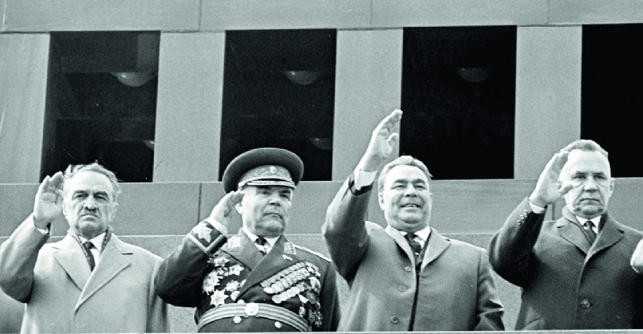 Na fotografii z roku 1965 (zľava doprava) Anastasa Mikojana, maršala Sovietskeho zväzu Rodiona Malinovského, Leonida Brežneva a Alexeja Kosygina, ako si pripomínajú 20. výročie víťazstva nad nacistami