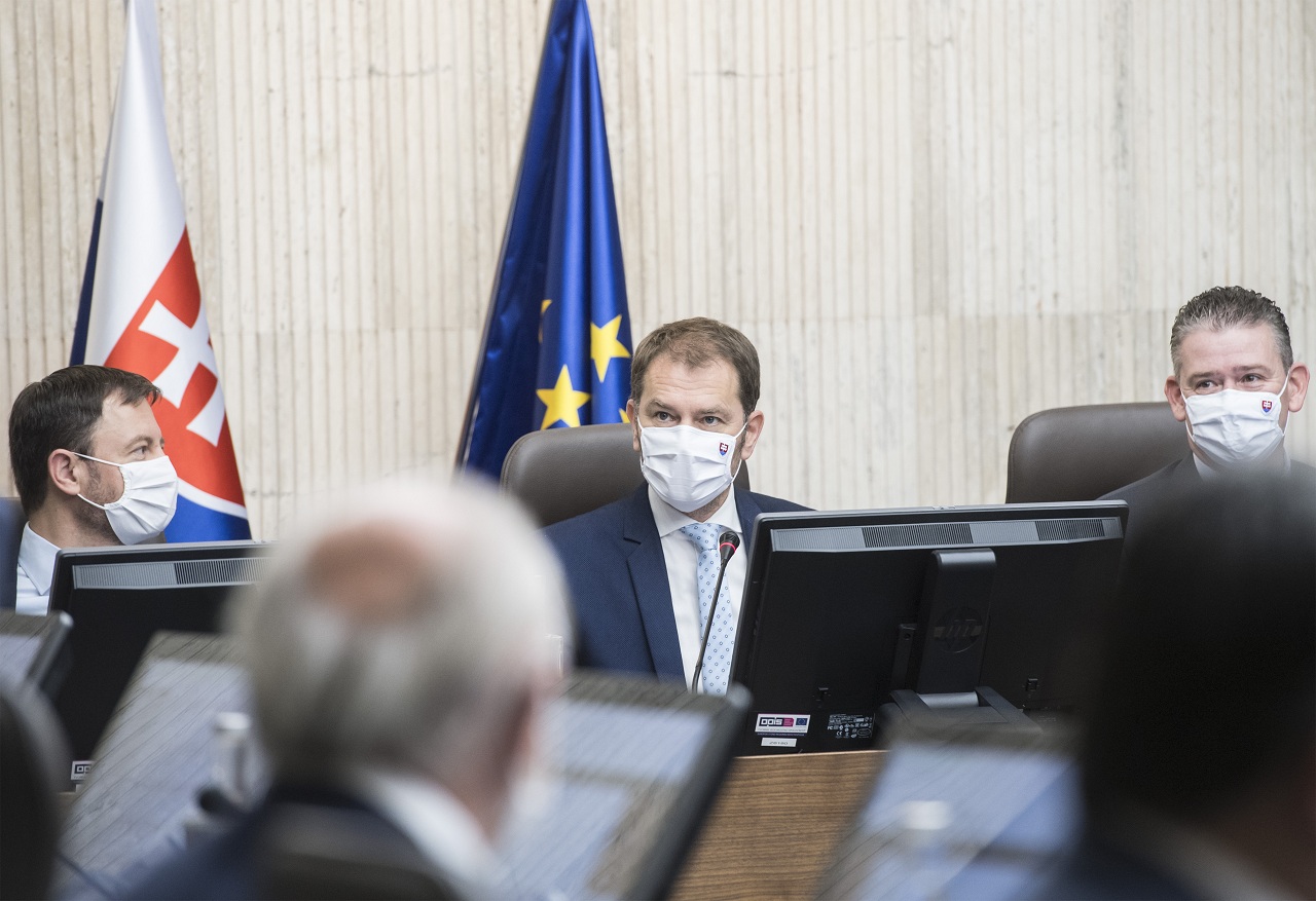 Na snímke zľava podpredseda vlády a minister financií SR Eduard Heger, premiér SR Igor Matovič a minister vnútra SR Roman Mikulec (všetci OĽaNO)