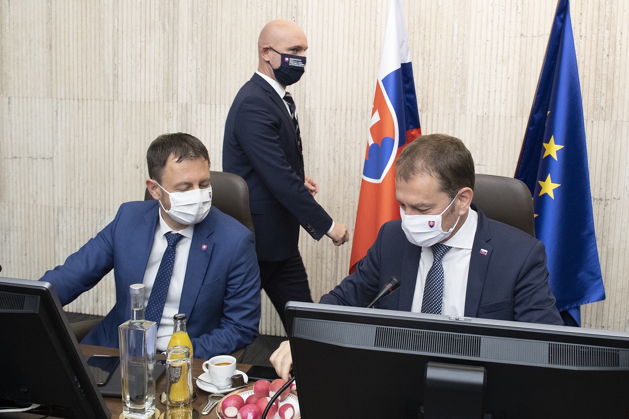 Na snímke sprava predseda vlády SR Igor Matovič (OĽaNO), podpredseda vlády a minister financií Eduard Heger (OĽaNO) a v pozadí minister školstva Branislav Gröhling (SaS)