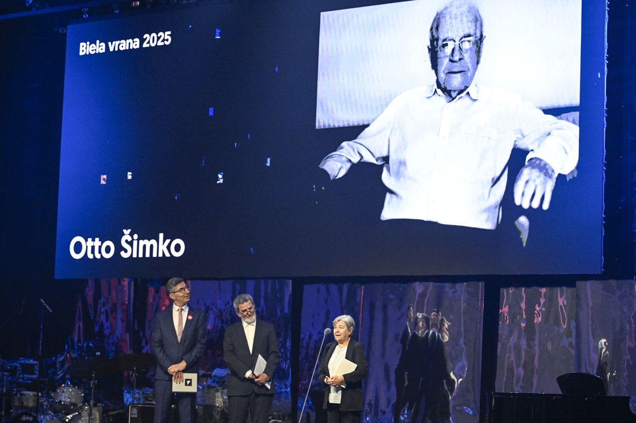 Na snímke dcéra Otta Šimka (vpravo) a laureát Otto Šimko (na obrazovke) ocenený za celoživotný prínos počas 18. ročníka ocenenia Biela vrana 2025 / Foto: SITA-Milan Illík