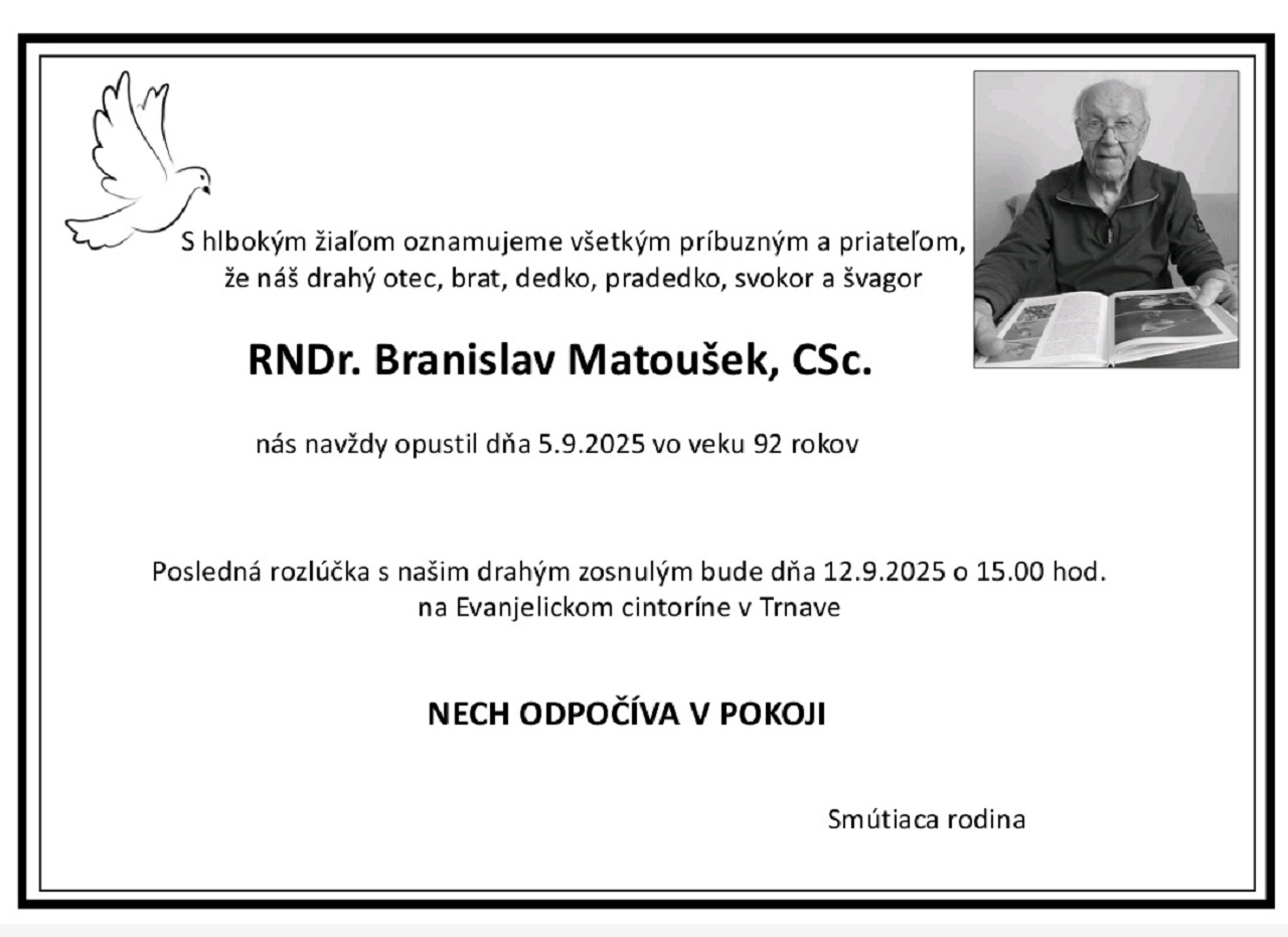 Vo veku 91 rokov zomrel významný prírodovedec, zoológ, ornitológ a bývalý riaditeľ Slovenského národného múzea (SNM) Branislav Matoušek. SNM o tom informuje na svojom webe