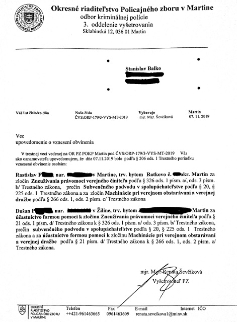 Opodstatnenosť mojich zistených podozrení potvrdzuje aj skutočnosť, že Okresné riaditeľstvo policajného zboru, Odbor kriminálnej polície Martin dňa 14.5.2019 začalo trestné stíhanie podľa § 199 ods. 1 Trestného poriadku vo veci zločinu subvenčného podvodu podľa § 225 Trestného zákona. Ďalšie moje zistenia boli postúpené oddeleniu operatívy OR PZ OKP.