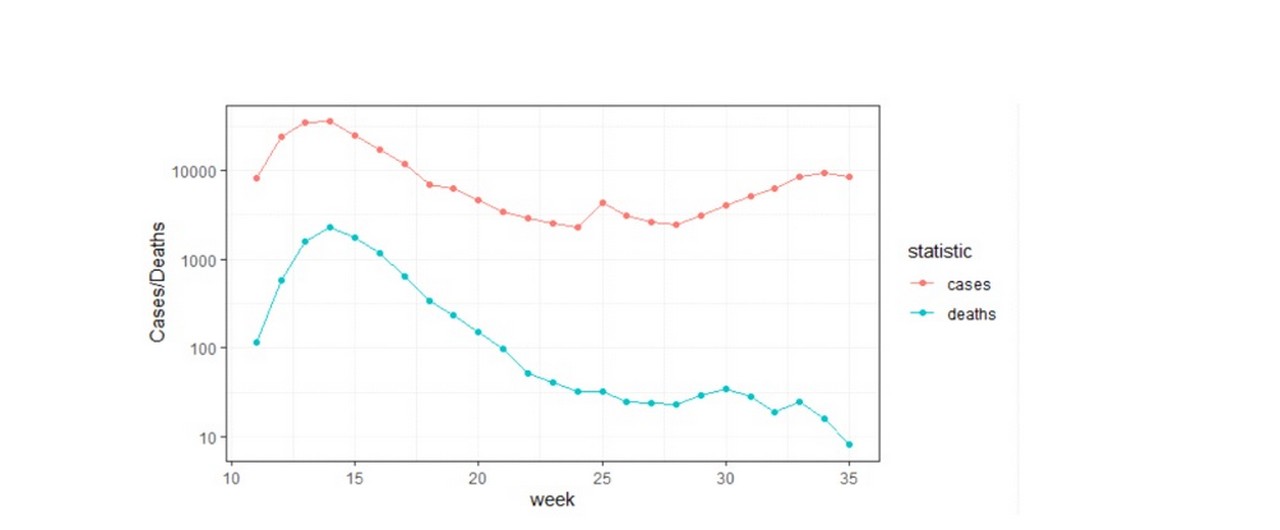 Zamerali sa na obdobie od 10. do 35. týždňa tohto roka, teda od marca do konca augusta. Ako môžete vidieť na grafe nižšie, dlhú dobu počet úmrtí na koronavírus kopíroval počet infikovaných – či už smerom nahor, alebo nadol.