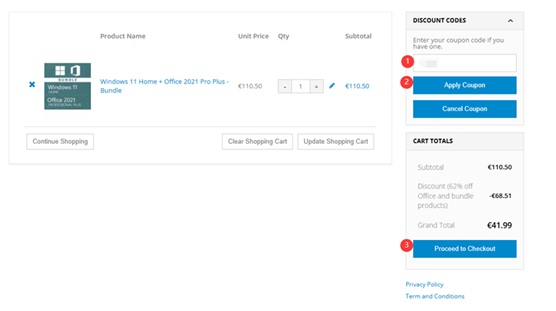 • Pridajte produkt do nákupného košíka a vyplňte kód kupónu, po potvrdení kliknite na „Pokračovať k pokladni“ (“Proceed To Checkout”) !