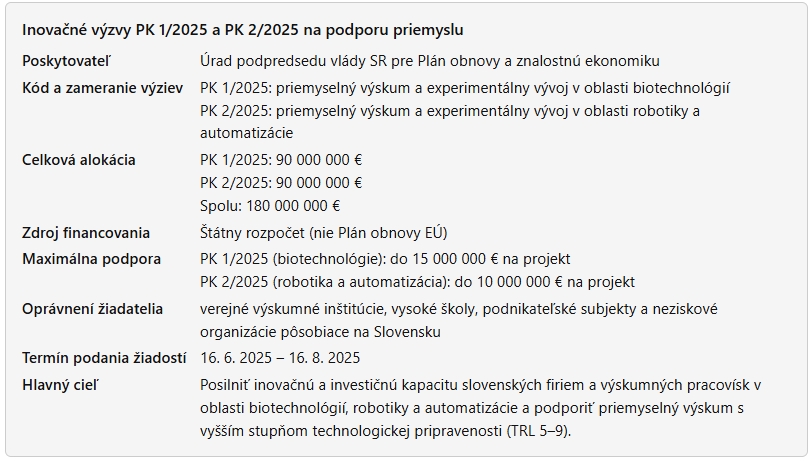 Hoci sa dnes všetko točí okolo pochybení, treba pripomenúť, čo bol pôvodný zmysel oboch výziev. Ako upozorňuje aj Asociácia strojárskeho a elektrotechnického priemyslu (ASEP), slovenský priemysel dlhodobo stráca tempo: zatiaľ čo v Európe modernizácia výroby napreduje, na Slovensku technologické investície spomaľujú a firmy narážajú na rastúcu konkurenčnú nevýhodu. Firmy chcú modernizovať, no pri vysokých úrokoch a drahej energii je návratnosť nízka.