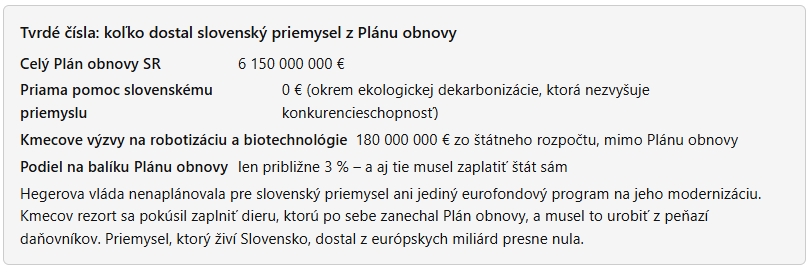 A tu sa dostávame k jadru problému, ktorý v kauze úplne zapadol. Na robotizáciu, automatizáciu či inovačnú modernizáciu priemyslu sa malo pôvodne čerpať z Plánu obnovy, ako to urobili Česi, Poliaci alebo Nemci. Tam investície smerovali práve do toho, čo dnes ťahá ekonomiku nahor.