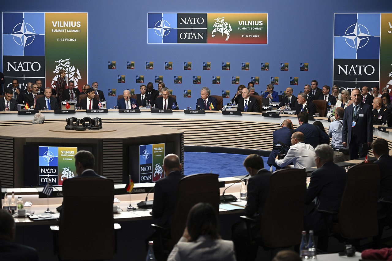 Na snímke účastníci počas rokovania Severoatlantickej rady na summite NATO vo Vilniuse