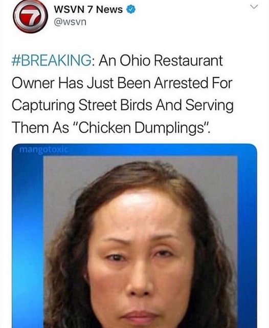 WSNS7 News uverejnila, že žena bola zatknutá za chytanie vtákov, ktorých mala následne servírovať ako kuracie knedlíčky vo svojej reštaurácií.