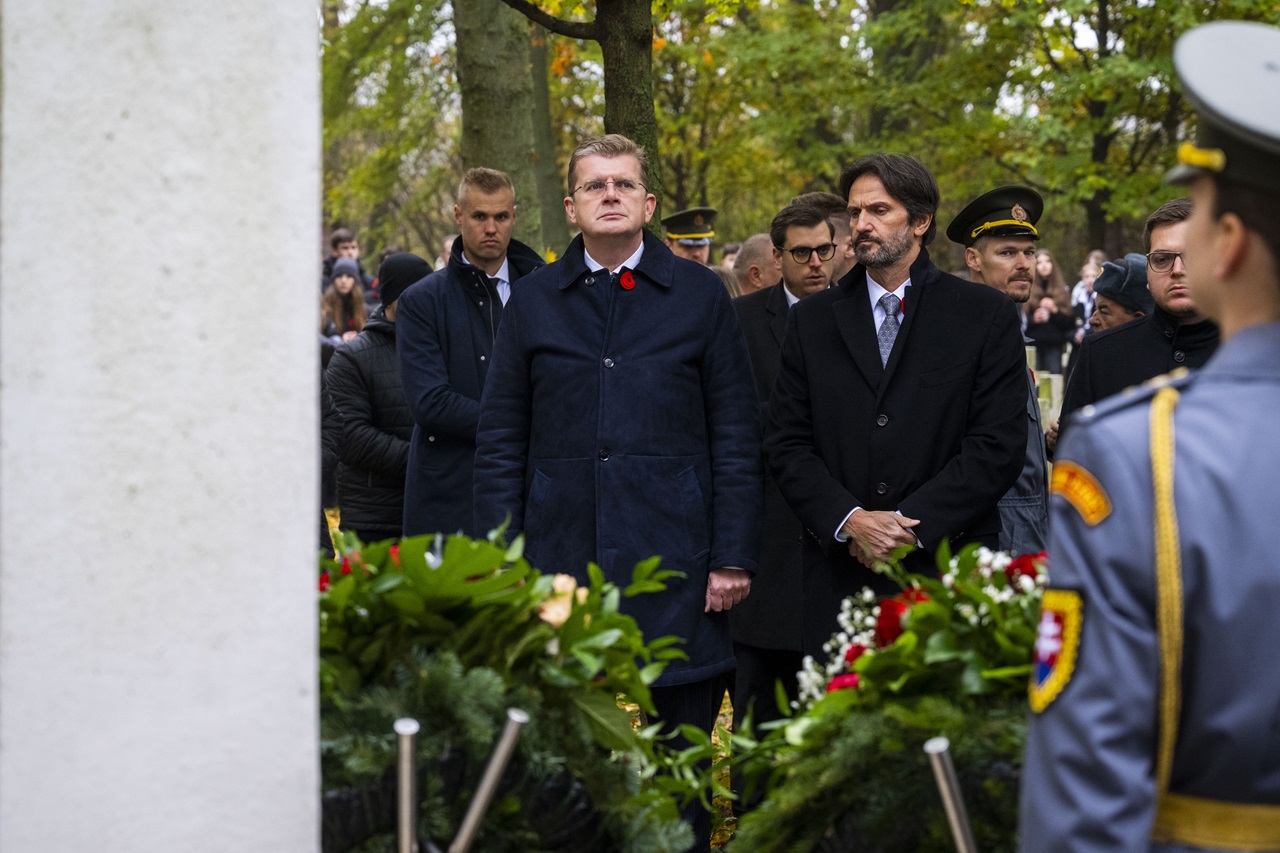Na snímke v popredí zľava podpredseda Národnej rady (NR) SR poverený jej vedením Peter Žiga (Hlas-SD) a minister obrany SR Robert Kaliňák (Smer-SD) počas pietneho aktu kladenia vencov pri príležitosti Dňa vojnových veteránov na vojenskom cintoríne v Petržalke – Kopčanoch 11. novembra 2024