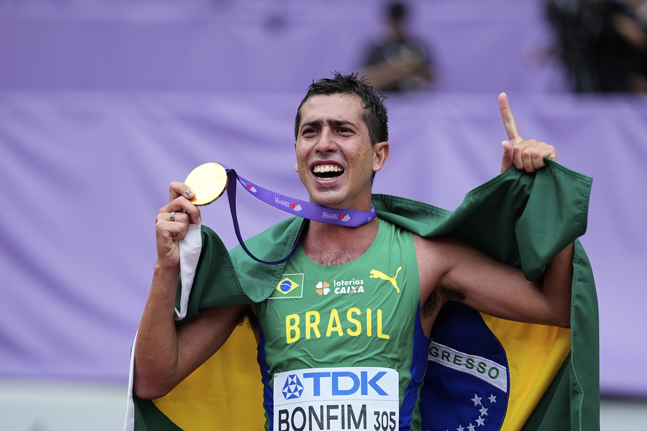 Na snímke Brazílčan Caio Bonfim oslavuje po získaní zlatej medaily v chôdzi na 20 kilometrov na Majstrovstvách sveta v atletike v Tokiu / Foto: SITA/AP-Matthias Schrader