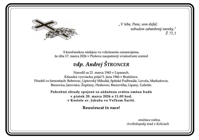 V Prešove v utorok 17. marca 2026 zomrel, zaopatrený sviatosťami, kňaz Andrej Štroncer. Pohrebné obrady spojené so zádušnou svätou omšou budú v piatok 20. marca 2026 o 11:00 v Kostole sv. Jakuba vo Veľkom Šariši